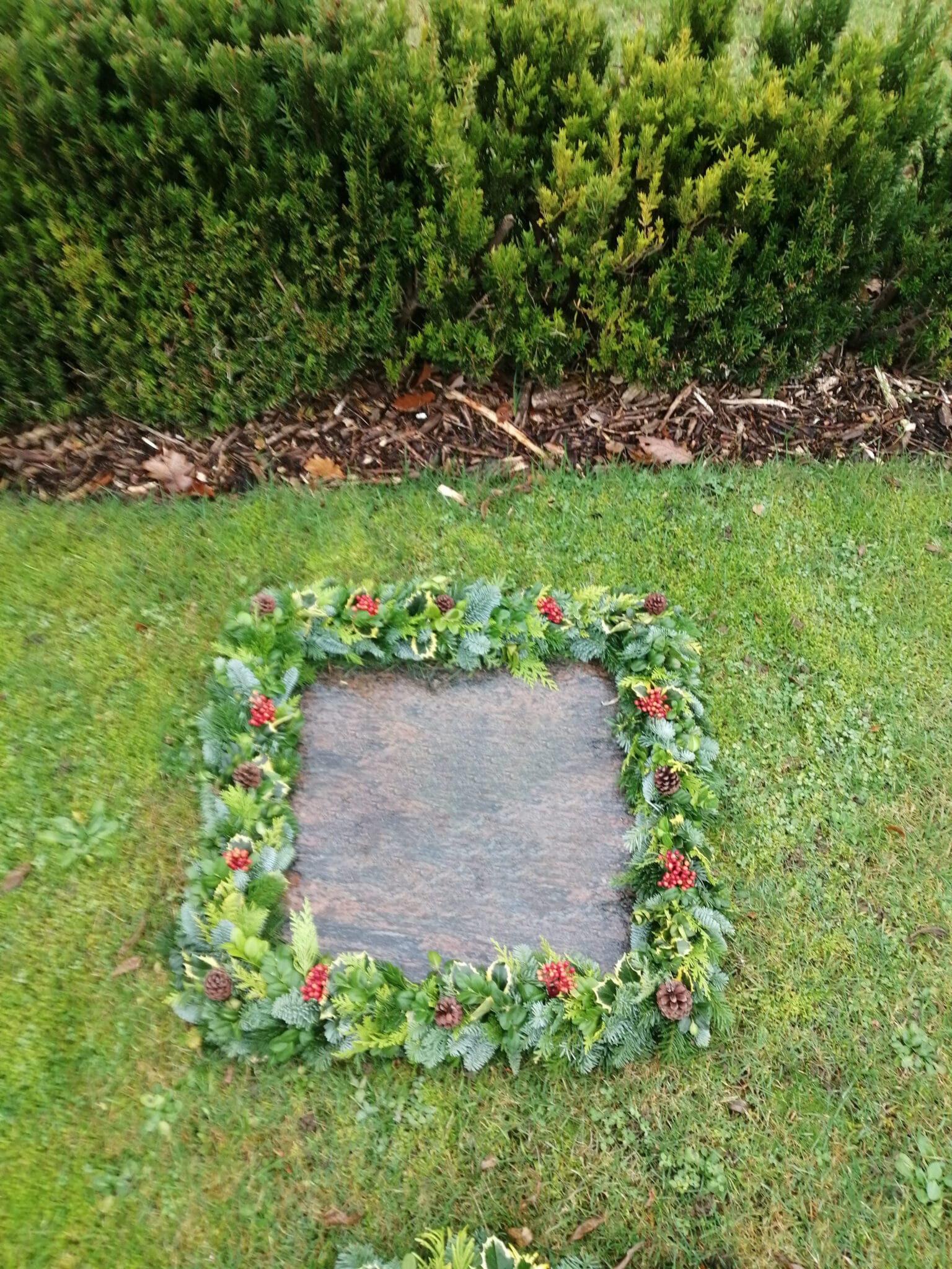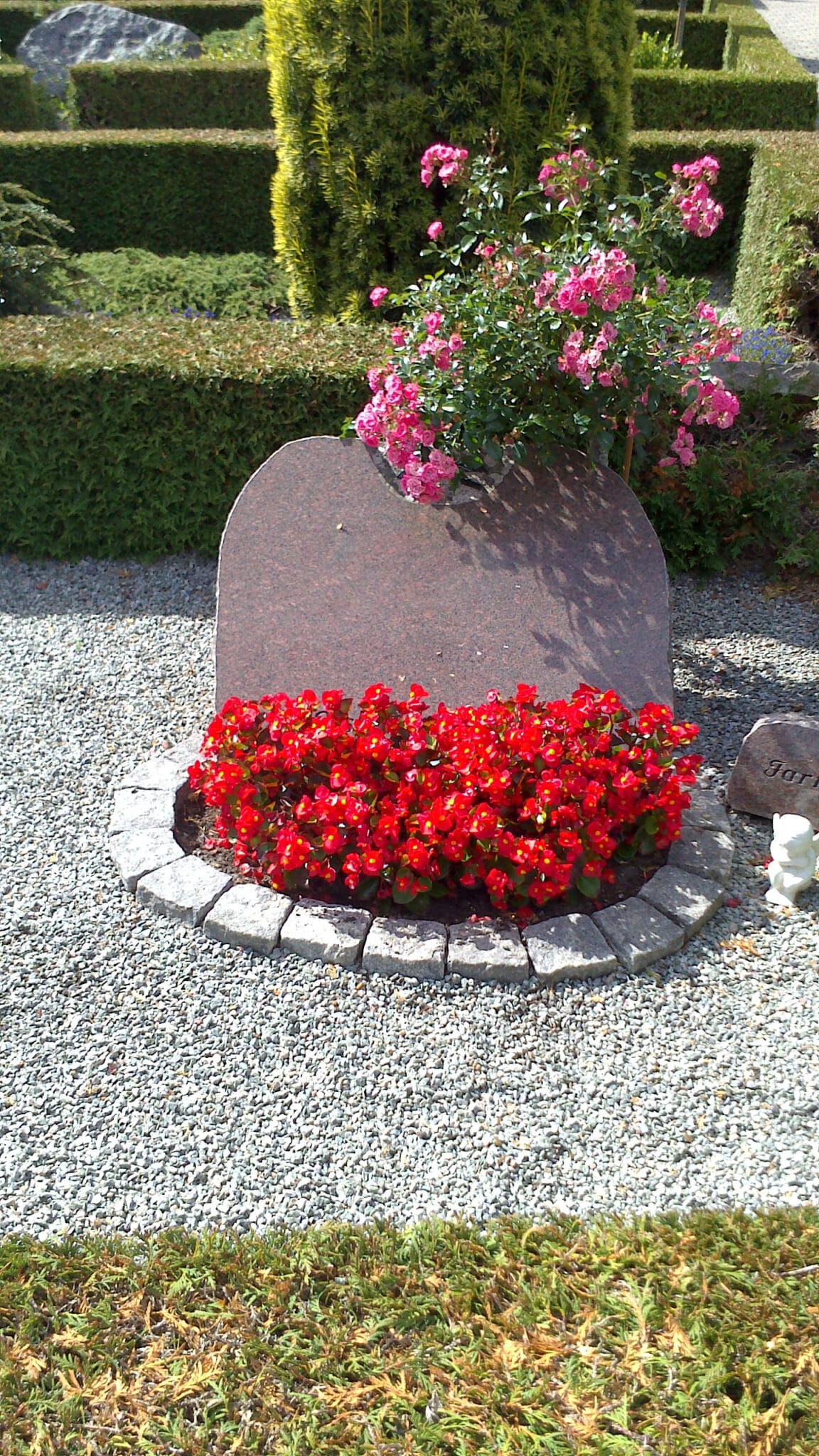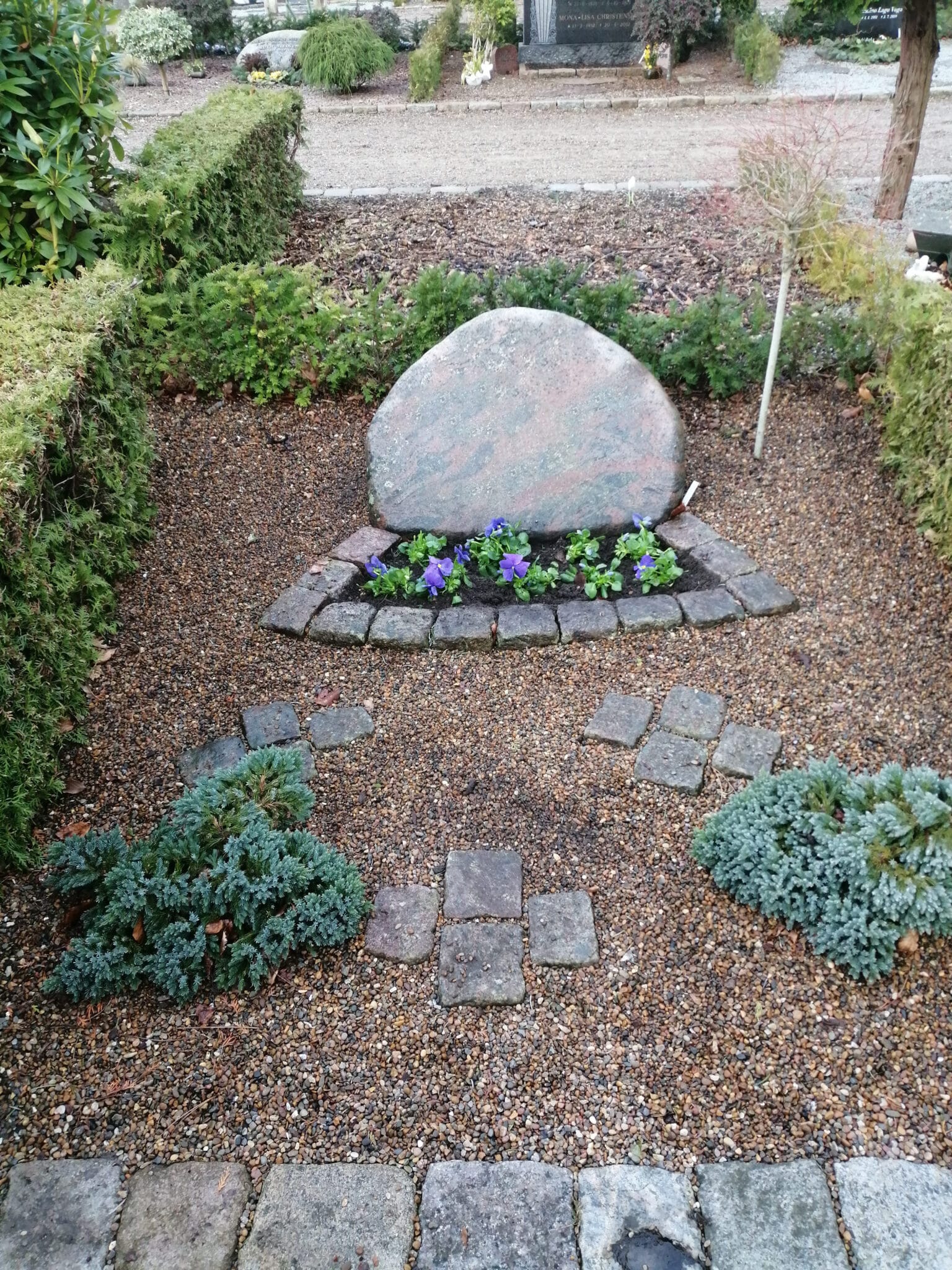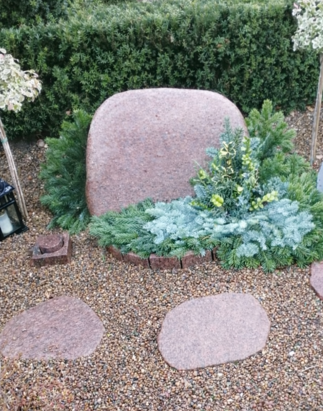 Pyntningen kan variere, da ikke alle blomsterbed er lige store, men vi prøver at tilpasse den til det enkelte gravsted, og er der ikke blomsterbed, laver vi pyntning i grus foran monumentet.